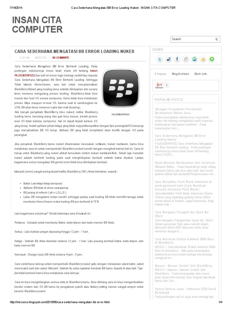 Berikut cara mengatasi nuked pada handphone blackberry 1. Memperbaiki masalah blackberry mati, hank atau restart. Cara sederhana lainnya untuk memperbaiki blackberry nuked yaitu dengan melakukan cabut . Cara mengatasi blackberry mati total (matot) dan nuked!!: Untuk memperbaiki bb yang rusak karena .